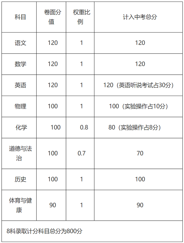 1.优化高中阶段学校招生录取计分科目设置。高中阶段学校招生录取计分科目包括语文、数学、英语、物理、化学、历史、道德与法治、体育与健康共8个科目。高中阶段学校招生录取计分科目满分为800分,各科的卷面分值和纳入录取总分的权重比例见下表: