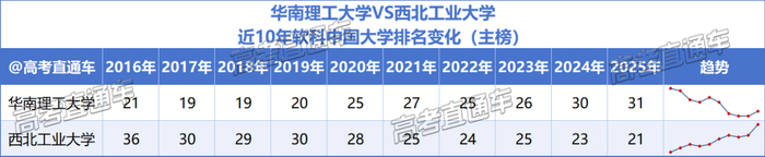 但是从2023年开始,西北工业大学排名逐年上升,而华南理工大学却是整体呈现下降趋势。通过两所高校排名变化的明显对比,也可以更直观看到,华工可以说是最近10年跌幅最明显的985高校。