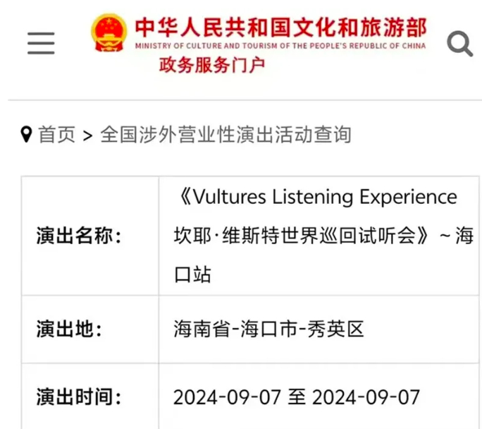 看到粉丝火爆的热情,海口市旅文局更是有求必应,9月21日,坎耶·维斯特海口试听会将在海口五源河体育场加演一场。