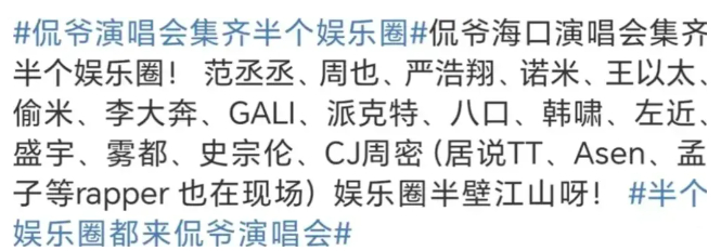 范丞丞、王以太、周也等不少内娱艺人都去看了侃爷在海口的演唱会,当天几乎集齐了半个娱乐圈。