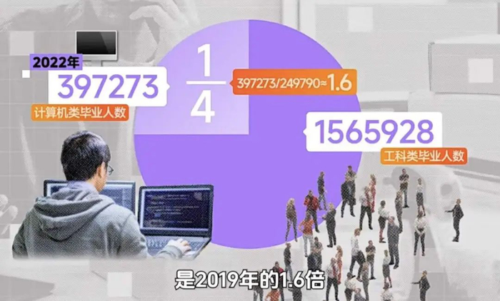 结果就是,2022年计算机类的毕业人数,占到整个工科的四分之一,是2019年的1.6倍;而2022年计算机类的在读人数有177万,位列工科第一。