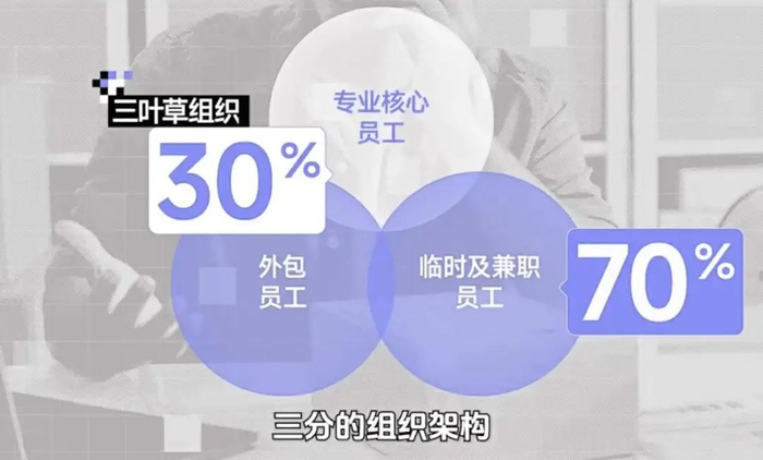 简单说,就是核心员工、外包员工、兼职人员,三分的组织架构。如此不仅能实现降本增效,还能应对周期性的业务需求。