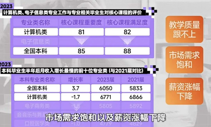 和定向放水相对的,是教学质量跟不上、市场需求饱和以及薪资涨幅下降,计算机类毕业生,在实际操作和解决问题上的能力满足度,要低于本科平均水平(89%)。