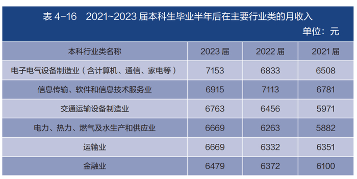 2023届电子电气设备毕业生的月收入是7153,反超信息技术位列第一;交通运输设备的月收入持续增长,位列第三。
