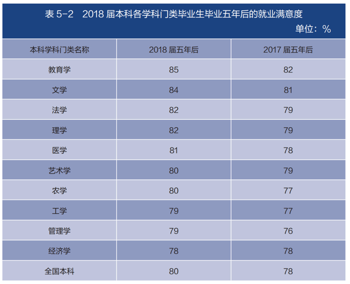 细化到专业上,文学和教育学的就业满意度高达85%。