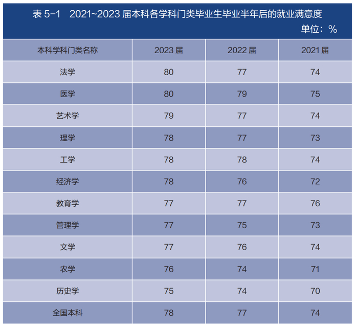 2023届毕业半年,就业满意度最高的是法学和医学,都是80%。不难理解,这两个领域的专业性很强,职业发展路径清晰。