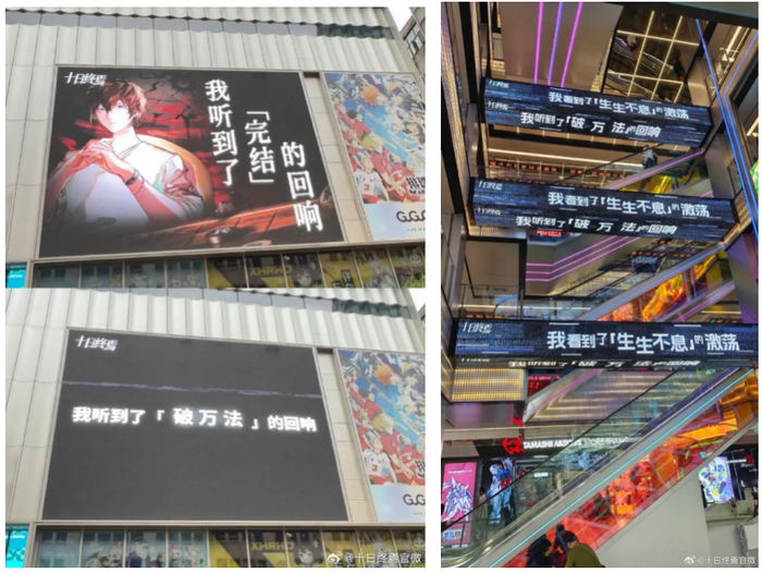 其二,另一部番茄巅峰榜榜首作品《十日终焉》,作者杀虫队队员,自2022年连载以来,短短两年时间就让十日终焉的名字回响在B站、小红书、知乎等各大社交媒体平台。迫不及待想看到荧幕作品的用户们,还自发制作了诸如有声漫画、配音广播剧、精彩台词混剪视频等二创作品。依然是短短两年,2024年10月31日作品完结,同时,《十日终焉》IP也进入到动漫影视双剧集并行开发阶段。