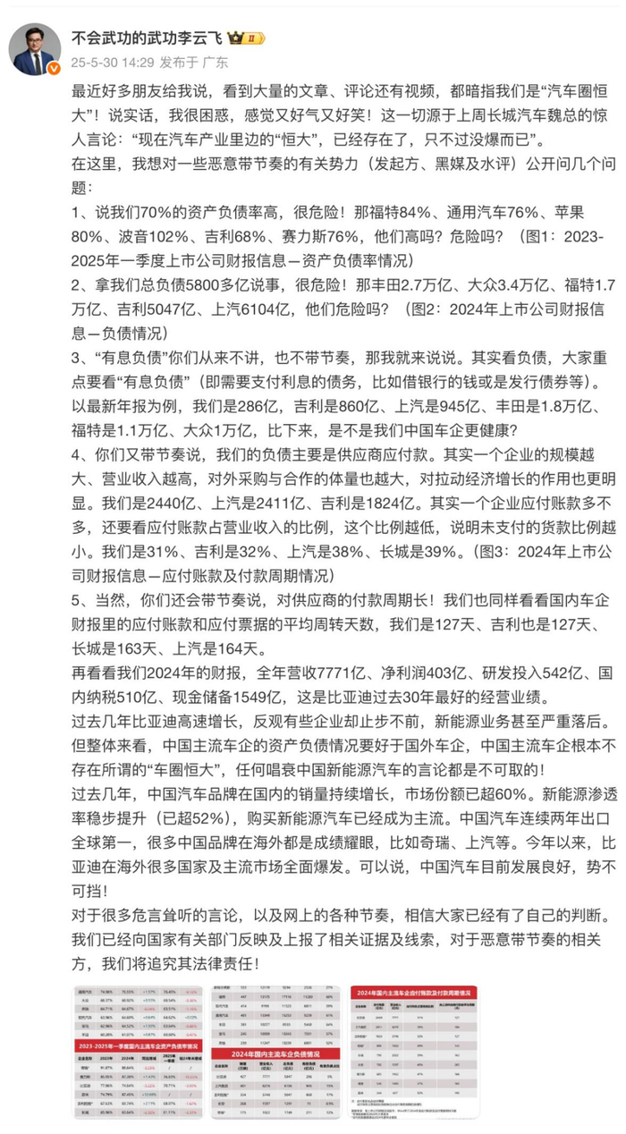 比亚迪品牌及公关处总经理李云飞近日也在微博中表示,不少人说“车圈恒大”暗指比亚迪,但其列出的数据也明确显示,比亚迪的资产负债率并不突出,除了一众超过76%的车企,科技巨头苹果公司有80%、波音102%。