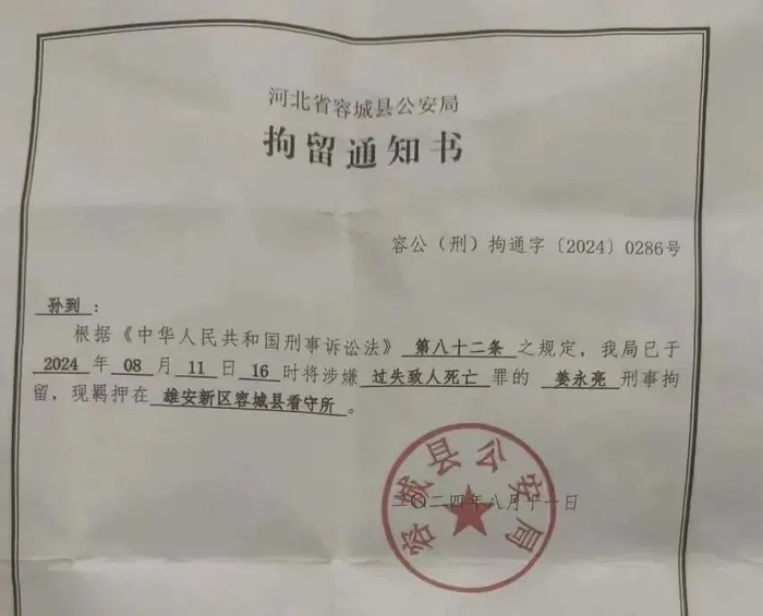 2024年8月25日,姜永亮因涉嫌过失致人死亡罪,被容城县检察院批准逮捕。这也就意味着,司法机关基于一定证据证明他有犯罪事实。