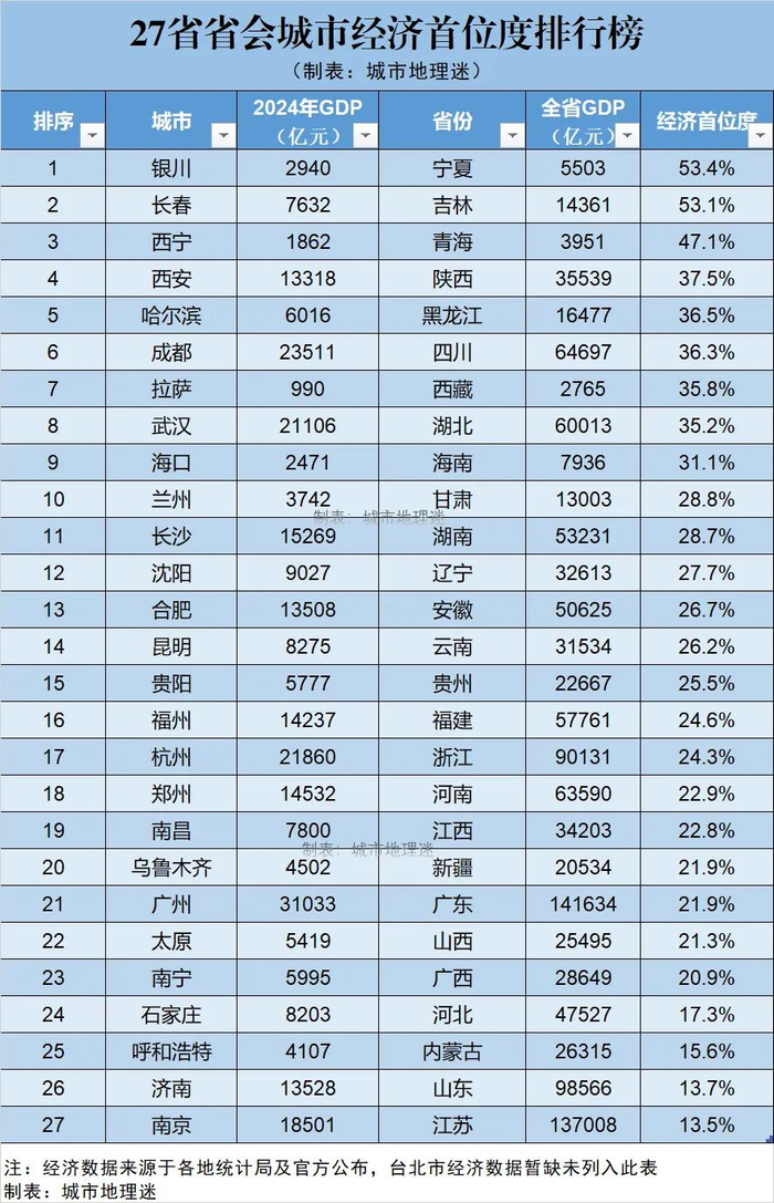 看看这张省会GDP首位度图表,省会在全省GDP的占比,能够很简明地显示一个省的经济重心和发展模式。从比例来看,南京全国省会城市垫底,仅占全省GDP的13.5%。