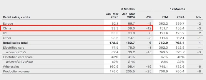 根据沃尔沃汽车此前公布的2025年第一季度财报,其营收为829亿瑞典克朗,相比去年同期的939亿瑞典克朗下滑11.7%;营业利润为19亿瑞典克朗,相比去年同期的47亿瑞典克朗下滑59.5%;息税前利润率也从5%降至2.3%。