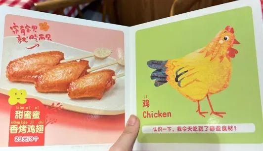 图源:小红书@momo西贝还把儿童菜单做成了识字绘本,封面写着“吃完一道菜宝贝就认识1-4种食材”。绘本里每道菜的菜名都配有拼音,鼓励孩子自己点菜。菜单对页是每种食材的中文、拼音和英语单词,虽然在烤鸡翅旁边画一只小鸡怎么看怎么像地狱笑话。