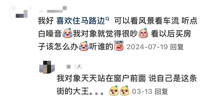 一些低能量、爱宅在家里的i人,还把临街房当成了富养自己的能量场。“除非能住小区里的树景房或者花园房,不然看着对面的楼房迟早抑郁,感觉自己住进了鸽子笼。住临街房最起码还是景观位的鸽子,窗外是车水马龙,反而会有一种烟火气和陪伴感。”