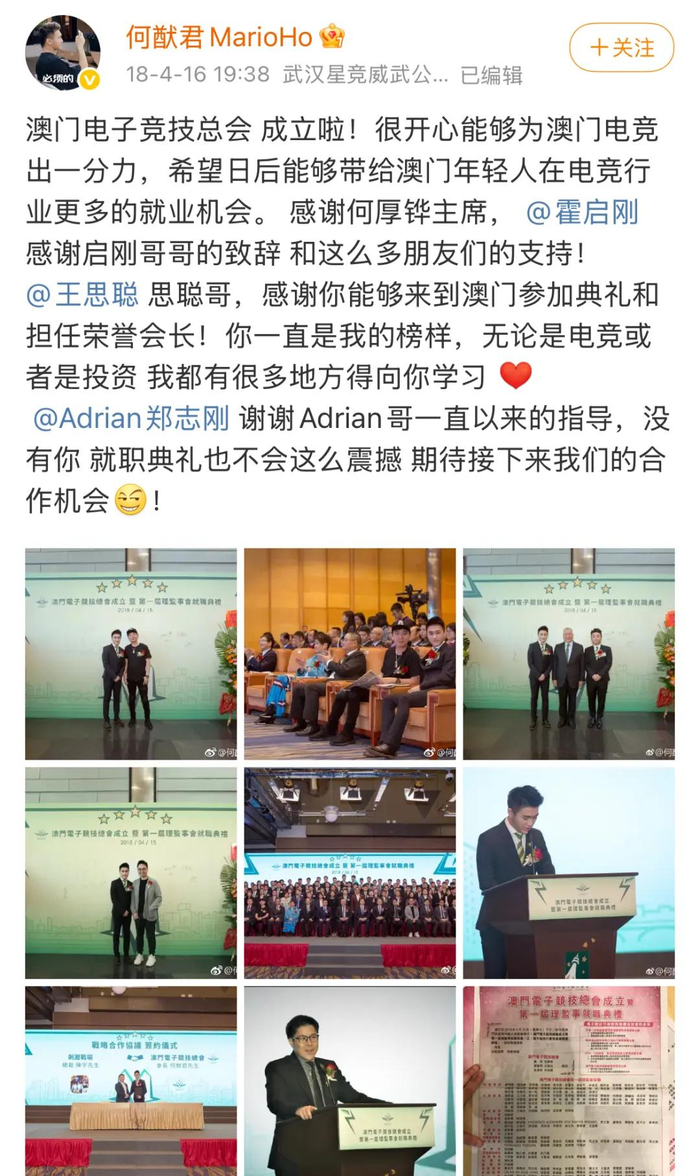 但他很快出现了。2018年,何猷君成立V5电竞俱乐部与澳门电子竞技总会,这才有了上述的一幕:何猷君在微博上向王思聪表达敬意。