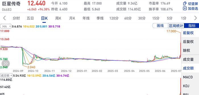 7月9日,巨星传奇(06683.HK)小幅低开,到11点多,突然快速拉升,盘中最高涨幅一度超过160%。全天收于12.440港元/股,上涨94.38%,总市值106.9亿港元,一天上涨了约50亿港元。全天交易额达114.8亿港元。