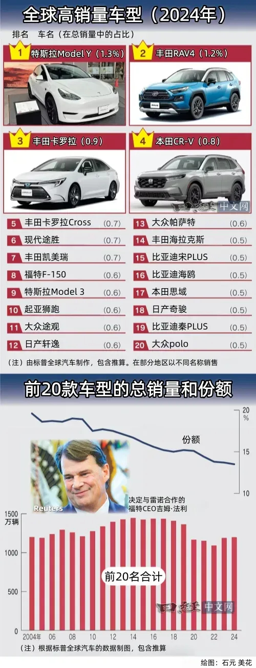 日本经济新闻根据标普全球汽车(S&P Global Mobility)的数据统计发现,过去20年间,全球销量排名前20的车型在整个市场上的占比已从20%下滑到14%。