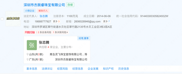 企查查企业信息显示,杰我睿成立于2014年,法人为张志腾,是一家专业珠宝企业。