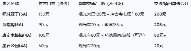 还是以甘孜州游客必去的两个核心景区为例,稻城亚丁,一张门票价格大约是150元,但是,如果游客想真正走进景区深处看到神山,120元观光大巴和80元电瓶车是躲不开的刚需。