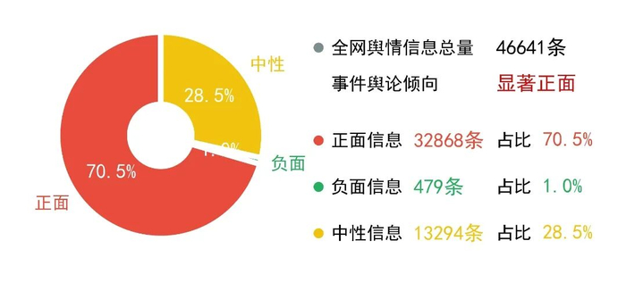 截止2月5日,此事件匹配的到全网舆情信息总量为46641条,正面信息32868条,占比70.5%,负面信息479条,占比1.0%,中性信息13294条,占比28.5%,事件舆论呈现出显著正面的倾向。