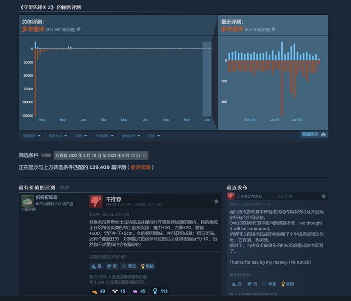 除此以外还有种种离谱的运营操作和不时出现的管理层暴论,以至于2023年8月暴雪将OW2上线steam平台的时候,两天不到就达成了差评如潮的战绩。