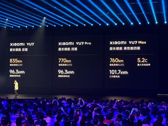 小米YU7共分三个版本,标准版与Pro版搭载的都是96.3kWh的磷酸铁锂电池,标准版续航里程达到835km,Pro版由于是四驱配置,便只有770km。Max版本搭载的则是101.7kWh的三元锂电池,综合续航达到760km。