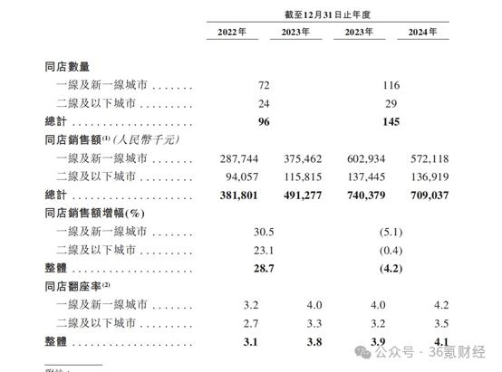 根据招股书的披露,2022-2024年间,遇见小面的订单数量从1416万单扩大至4209万单,CAGR为72.4%;但同期的订单平均消费金额则从2022年的36.1元降至2023年的34元,进一步降至2024年的32元,同期翻座率并没有太大变化,2024年的翻座率甚至从3.8降至3.7。同店的经营情况也是类似趋势,24年的销售额也较23年下降了4.2%。