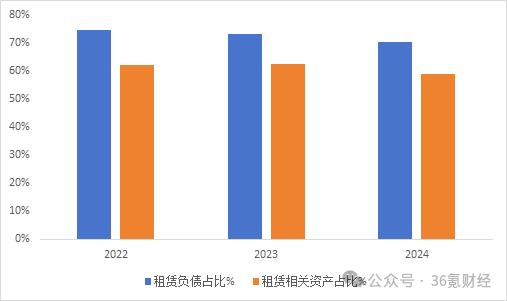 图:遇见小面资产负债率变化 数据来源:wind,36氪整理从负债结构看,其中70%以上的负债都是租赁相关负债,而在资产中,租赁资产的占比也维持在60%左右。因此可以看出,以自营模式为主的经营方式,直接导致了公司较重的资产结构,是其资产负债率持续高企的根本原因。