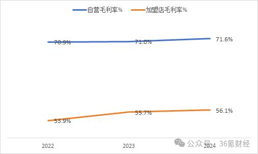 图:遇见小面净利润变化 数据来源:wind,36氪整理从利润构成看,2023年公司实现扭亏为盈,一方面,是因为2023年原材料及耗材成本占比从38.3%将至36.3%,导致毛利率从61.7%提升连个百分点至63.7%。毛利率提升背后正是基于毛利率更高的直营餐厅占比的增加。根据公司披露数据计算,2022-2023年,公司直营餐厅毛利率分别为70.9%和71%,而同期加盟店的毛利率却仅为53.9%和55.7%。