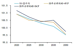 图:消费右移时对应的消费支出变化 数据来源:UN,CFPS,东吴证券研究所;注:2010-2022年平均消费支出=100,消费支出=Σ(i年龄段的人口权重*i年龄段的消费支出)