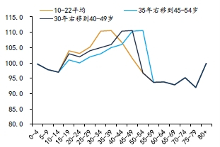 图:消费右移的假设情况 数据来源:Wind,东吴证券研究所;注:(1)2010-2022年平均消费支出=100;(2)控制两种右移假设下的各年龄段平均支出都为100,即假设人均消费支出不变