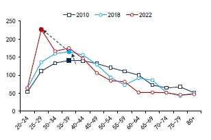 数据显示,2010-2022年,中国人消费的年龄结构呈现明显的倒U型特征,即30-40岁是消费高峰期,之后逐渐回落。