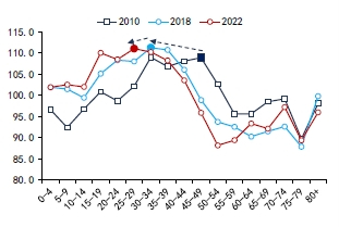 图:2010-2022年居民收入的“驼峰左移” 数据来源:CFPS,东吴证券研究所;注:各年龄段平均收入=100