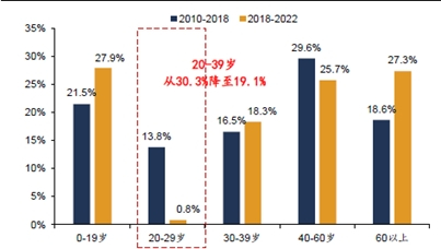 2010-2018年,20-39岁人口是消费增长的首要动力,贡献了30.3%的消费增长。但2018-2022年,该群体成为消费增速下降的“主要拖累”,贡献了高达44%的增速降幅。