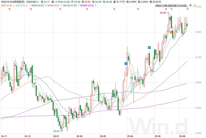 进入今年以来,创新药概念火爆,在过去几年间备受诟病的不少医药基金都因为重仓创新药而再次翻红。恒瑞医药(以下简称:恒瑞)作为国产创新药的旗帜,在进入2025年后股价持续上涨,截至6月11日,今年以来最大涨幅超过30%。拉长周期来看,恒瑞目前的股价相比2022年的阶段性低点已实现翻倍。
