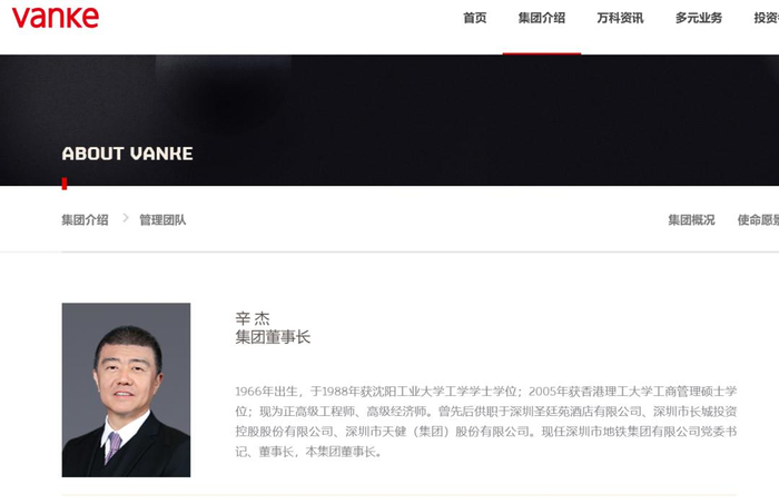 图源:万科官网辛杰是万科与深圳地铁集团的“双料”董事长。此前,除了担任万科董事、董事长之外,辛杰还是深圳地铁集团的党委书记、董事长。