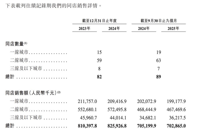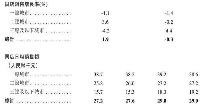 比如一线城市的同店销售额从2023年的2.11亿,下降至2024年的2.09亿,同店销售增长率为 - 1.1%;三线及以下城市为 - 4.2%,仅二线城市保持 3.6% 的正增长。
