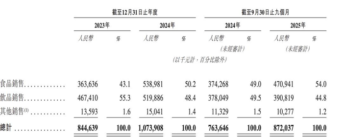 图源招股书值得注意的是,从2024年开始,COMMUNE的餐食营收开始超越饮品,2024年-2025年前九个月,食品销售额分别为5.39亿、4.71亿,占比由50.2%提升至54%。而2023年,55.3%的营收还由饮品销售贡献,食品只占到43%。