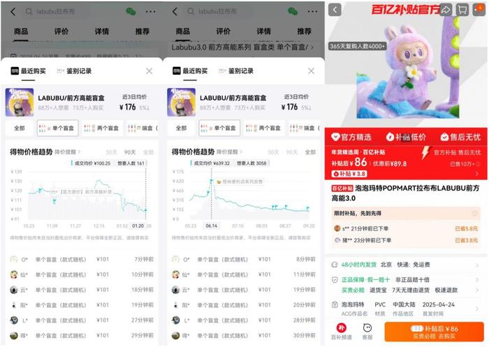 更为夸张的是,在天猫平台“百亿补贴”频道,一款未拆盒、未拆袋的盲盒最低售价86元,这甚至低于泡泡玛特本身的官方零售价。