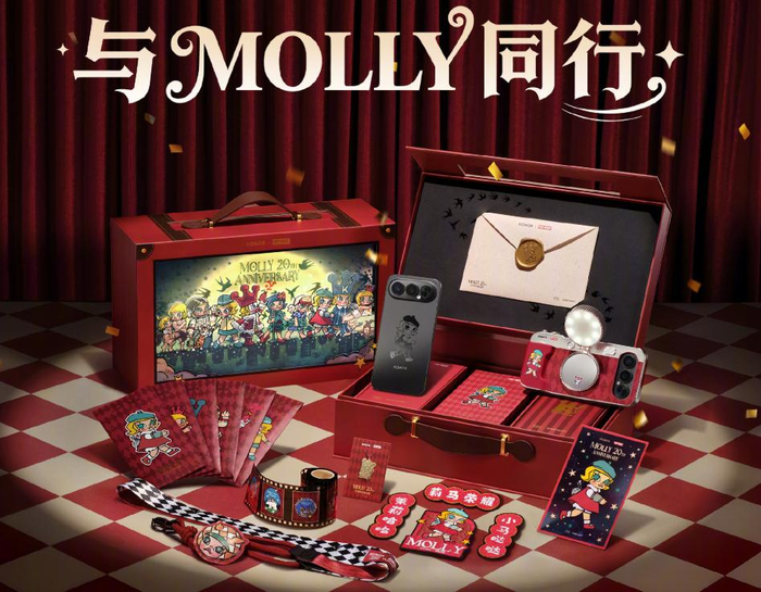 就在回购公告当天,泡泡玛特还与荣耀合作推出了“荣耀500 Pro MOLLY 20周年限定版”手机。该产品并非简单贴标,除手机后盖印有MOLLY形象外,系统还提供了专属的MOLLY UI主题、MOLLY开机动画、MOLLY拍照水印等。