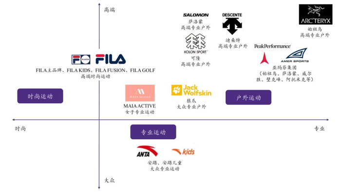 从当下结果看,安踏集团已明确形成了从大众到高端、从生活到专业的多品牌矩阵。其中,大众体育有安踏,时尚运动有FILA,女性运动有MAIA ACTIVE。在户外领域,高端有亚玛芬,中高端有滑雪起家的迪桑特、更偏向轻户外的可隆,大众则有狼爪。