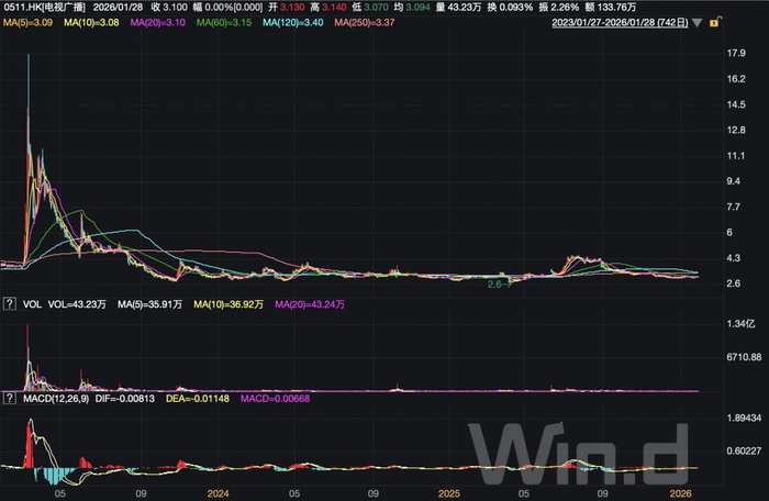 TVB股价在2023年触及18港元高点后,至今已一路跌回至3港元左右。