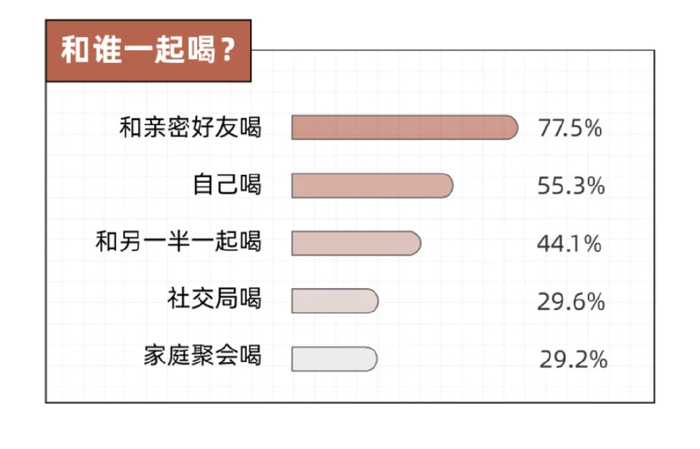 超过50%的年轻人喜欢在开心、放松的时候喝酒。总之,喝酒已经不再是排解苦闷的方法,而是生活里的“锦上添花”。喝酒也不再只是社交场上的觥筹交错,而是我们与家人好友在一起点缀气氛的轻松时刻。