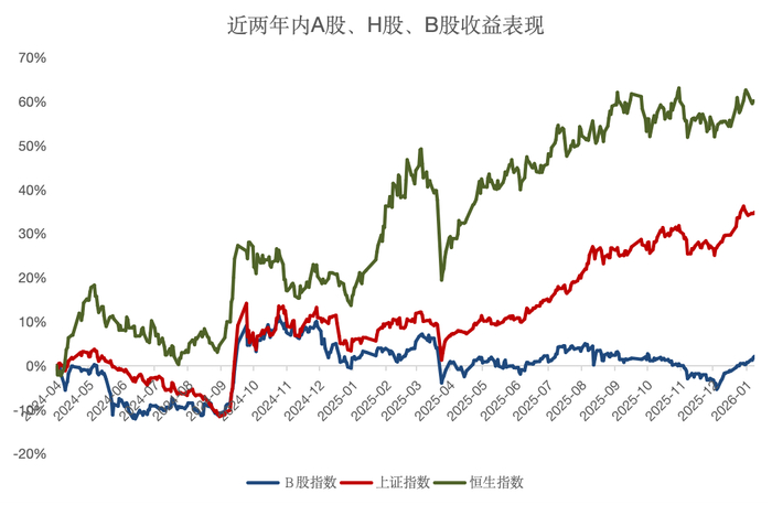 跳出个股视角来看,近两年来,B股指数收益长期在0%上下徘徊,甚至时常为负,而A股、H股主要指数表现均优于B股。尤其2025年4月之后,这一分化更加明显。