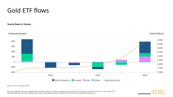 分区域来看,2025年北美市场流入黄金ETF的资金超过了500亿美元,成为全球布局黄金ETF资金的绝对主导力量,同期北美黄金ETF的管理规模高达2903亿美元;亚洲市场则延续了2024年对黄金的配置热情,2025年的流入规模接近翻倍至253亿美元,同期亚洲黄金ETF的管理规模约618亿美元;欧洲市场扭转了2024年持续流出的局面,2025全年流入了117亿美元,欧洲黄金ETF在同期的管理规模约1966亿美元。