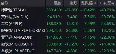 据e公司报道,4月3日-4日,美国股市连续两天遭受重创,当日收盘暴跌。个股方面,美股科技七巨头暴跌。特斯拉跌超10%,英伟达、苹果跌超7%。