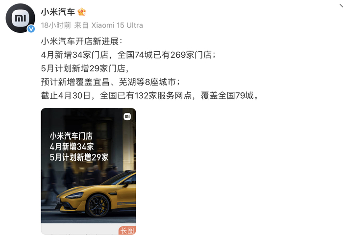 据新浪财经报道,@小米汽车 公布开店新进展:4月新增34家门店,全国74城已有269家门店;5月计划新增29家门店,预计新增覆盖宜昌、芜湖等8座城市;截止4月30日,全国已有132家服务网点,覆盖全国79城。