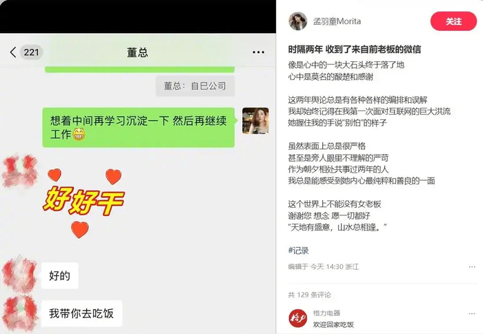 据界面新闻消息,5月20日下午,孟羽童在社交平台发文称,“时隔两年,收到了来自前老板的微信,像是心中的一块大石头终于落了地,心中是莫名的酸楚和感谢。”她还一并附上与董明珠的聊天记录,内容显示,董明珠回复孟羽童“好好干”“我带你去吃饭”。