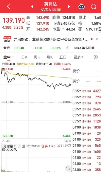 英伟达一度大涨超6%,总市值超越微软,成为全球市值最高上市公司。截至收盘,英伟达涨3.25%,报139.19美元,市值3.40万亿美元,其市值一夜增加1068亿美元(约合人民币7675亿元)。