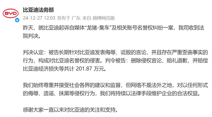 2024年底,比亚迪起诉自媒体大V“龙猪-集车”名誉权纠纷案获得法院支持,判决被告删除侵权言论、公开赔礼道歉,并赔偿比亚迪经济损失等共计201.87万元。