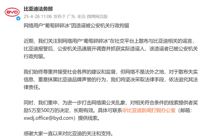 所以这一次比亚迪继续以雷霆手段打击黑公关行为,比亚迪法务部披露“葡萄碎碎冰”因散布比亚迪相关谣言,目前已被公安机关依法行政拘留。